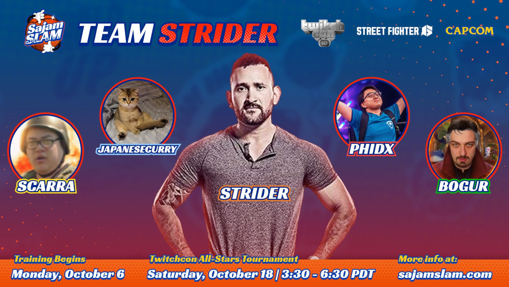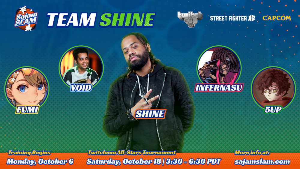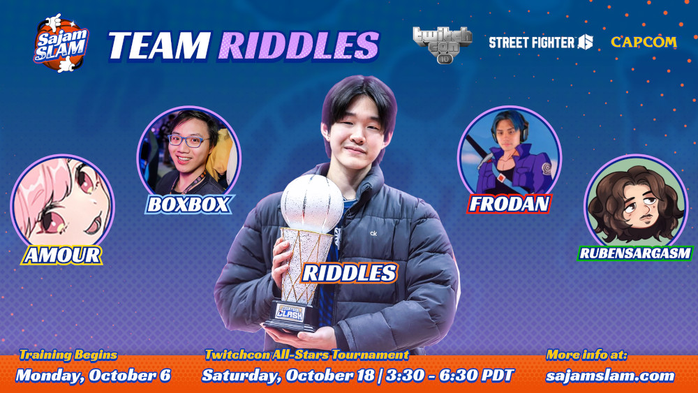 Visit the StoreSajam Slam is a series of fighting game events where streamers of any skill level get to learn a fighting game from a pro. They form teams, practice together on stream with their coach, and then play team tournaments — matched against players of similar skill — to decide the ultimate winner!